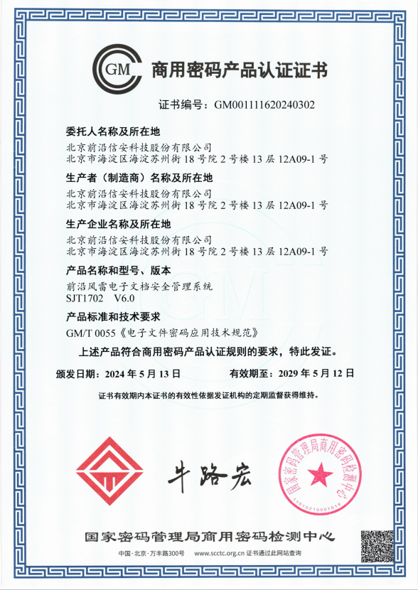 国家保密科技测评中心“涉密信息系统产品检测证书“